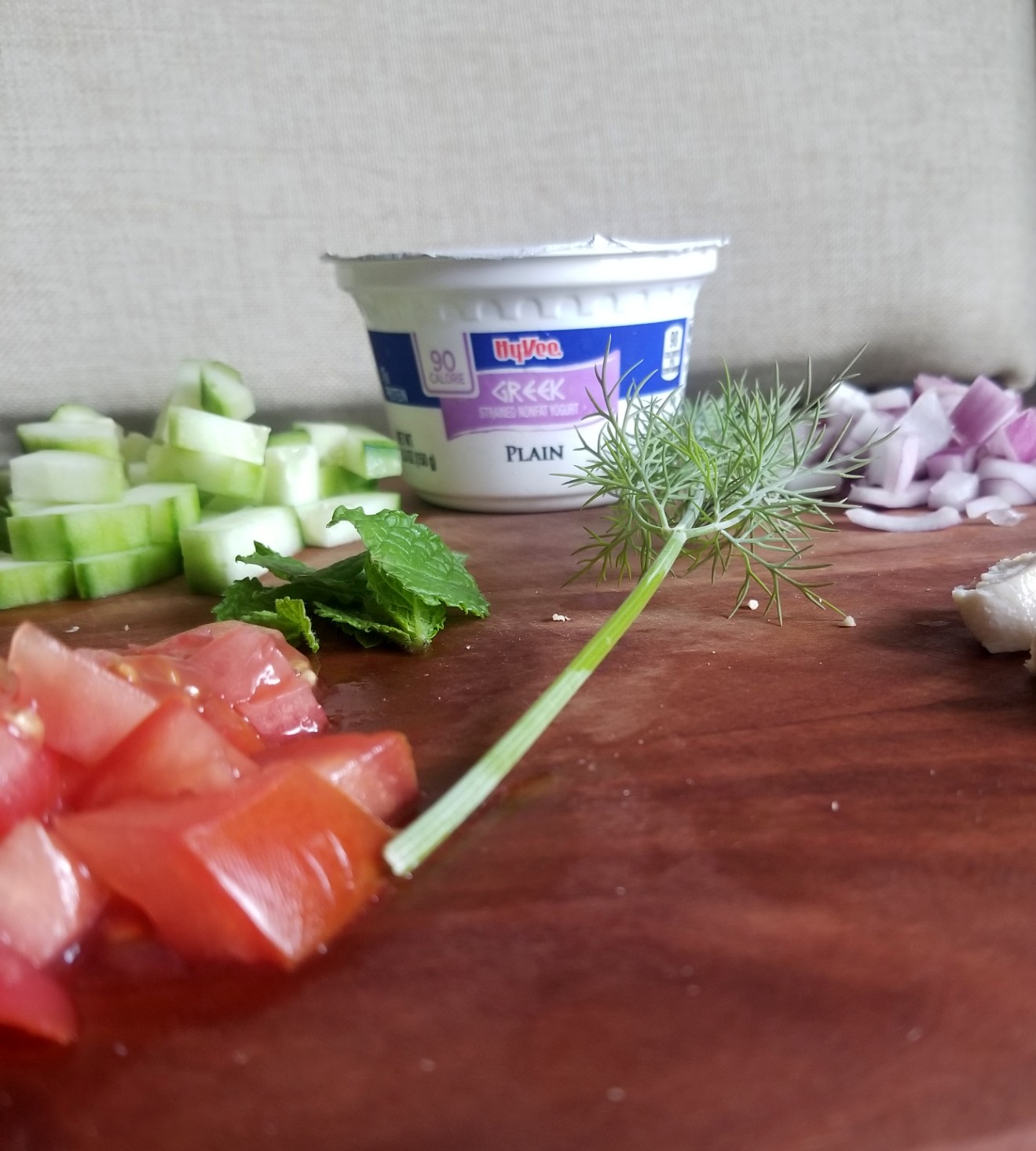 What makes my recipe a bit different of the traditional Tzatziki is I add 1/2 cup of chopped onion. I also have a secret ingredient, mint! I use one or two mint leaves and dice them very fine.